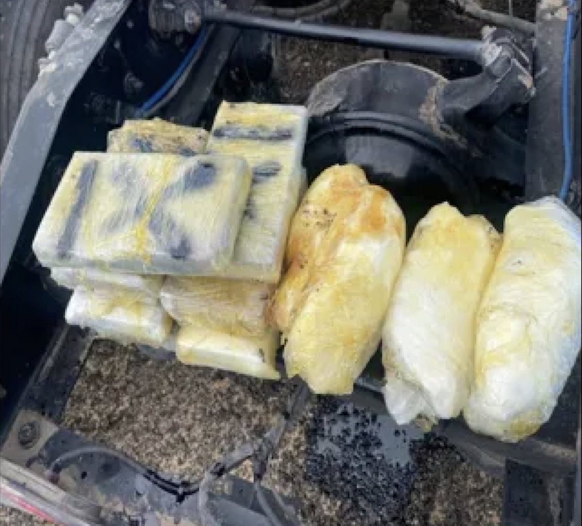 Officers noticed “fresh tool marks on the axle head” during the inspection, leading them to uncover 14 plastic wrapped packages containing 7.5 pounds of cocaine worth an estimated $198,500 and 8 pounds of methamphetamine worth an estimated $14,500.