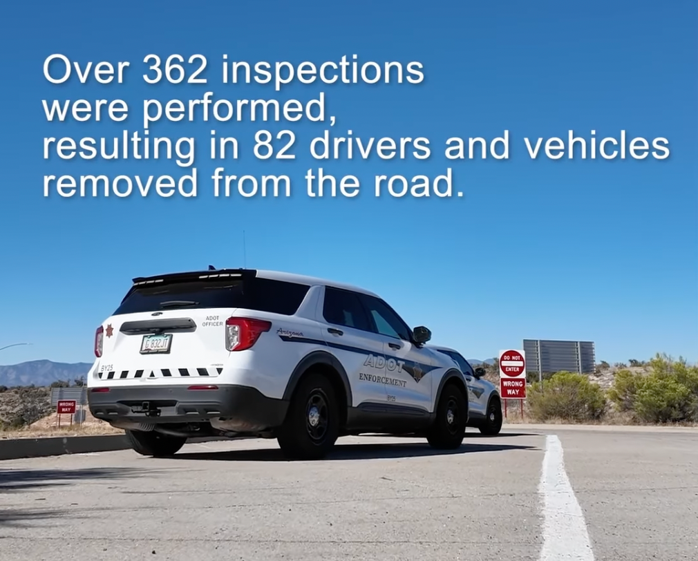 “During the operation, Level 2 commercial vehicle inspections were performed with an emphasis on driver qualification, behavior, impairment and electronic logging devices.A Level 2 inspection consists of a visual walk around the commercial vehicle for any plain view violations, which can include credentials for the driver and vehicle, as well as the undercarriage of the vehicle,” said ADOT.