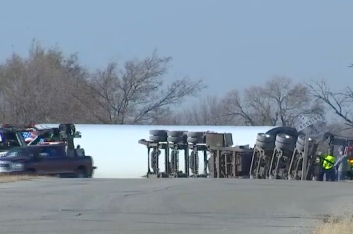 According to Fox 23, the tractor trailer was hauling part of a wind turbine down Tiger Switch Road when the trailer broke in half. The large cylinder then rolled onto the roadway.