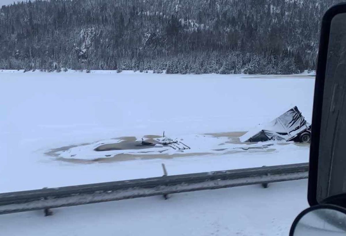 According to SN News Watch, the semi truck lost control during poor weather conditions and veered off of Highway 11, sending the truck onto the frozen Lake Nipigon.