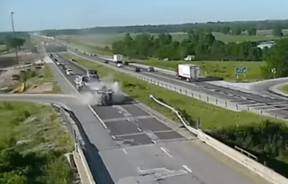 In the video, a tanker driver hauling doubles appears to hit the gas on a curved on-ramp while entering the highway. The truck then immediately flips, and slides across both lanes of the highway, spraying its load of liquid fertilizer.